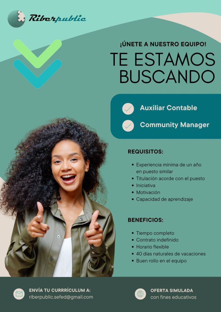 En nuestra empresa simulada, estamos llevando a cabo una oferta laboral para dos puestos: Auxiliar Contable y Community Manager. Buscamos personas motivadas, con ganas de aprender y aportar su creatividad e iniciativa.