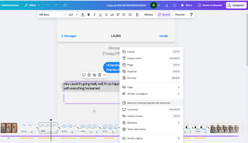 Aquí os compartimos el enlace que permite editar el vídeo, para que podáis ver cómo lo hemos hecho. Pero básicamente lo único que hemos hecho es planificar lo que queríamos contar, y cómo queríamos contarlo, modificar una plantilla de Canva, y ajustar la temporización de los elementos, que es una función nueva que desconocíamos. Cuando se añade un elemento a una presentación, o vídeo en este caso, haciendo click en el botón derecho del mouse, aparece un menú donde pone «Mostrar temporalización de elementos»